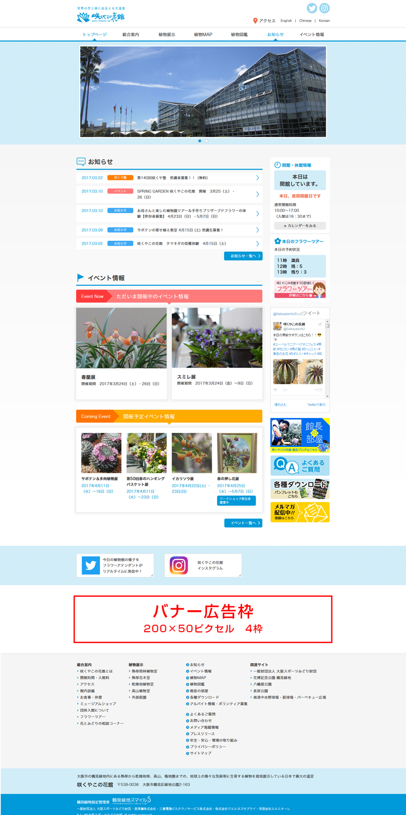 お問い合わせ窓口・申込書提出先 咲くやこの花館 HP広告バナー担当宛て 〒538-0036 大阪市鶴見区緑地公園2-163 開館時間:10:00~17:00(入館は16:30まで) 休館日:月曜休館(休日の場合はその翌平日)及び 年末年始(12月28日から1月4日) 電話:06-6912-0055 FAX:06-6913-8711