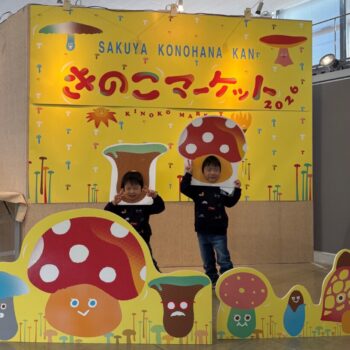 2026年チラシやポスターに登場する一風変わったきのこたちが登場するフォトブース。