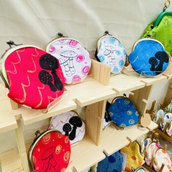 ー販売ー 手描きのオリジナルデザイン画を自身でシルクスクリーンにて手刷りして作った、オリジナル生地を使用して、がまぐち作品を生みだしています。 |