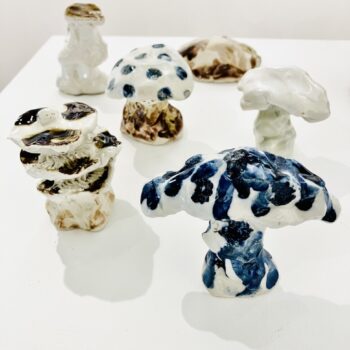 ー販売ー いろいろなきのこグッズが盛りだくさん。アパレル、紙もの等に加え、今回は新作の1点もの砥部焼きのこオブジェも登場?! |