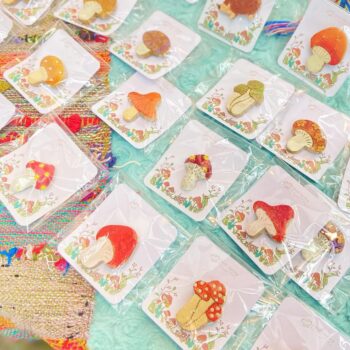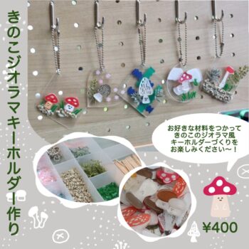 可愛いきのこモチーフの雑貨や、アクセサリーの販売、きのこ関連のワークショップなど