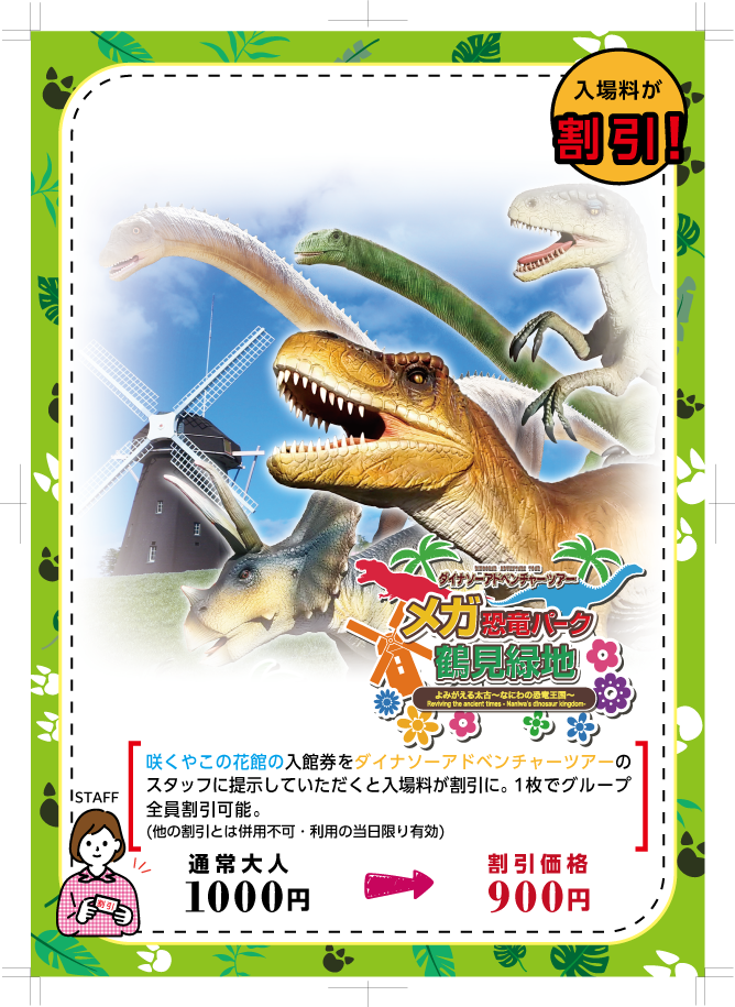 ダイナソーアドベンチャーツアー メガ恐竜パーク鶴見緑地 | 1,000円 → 900円 |