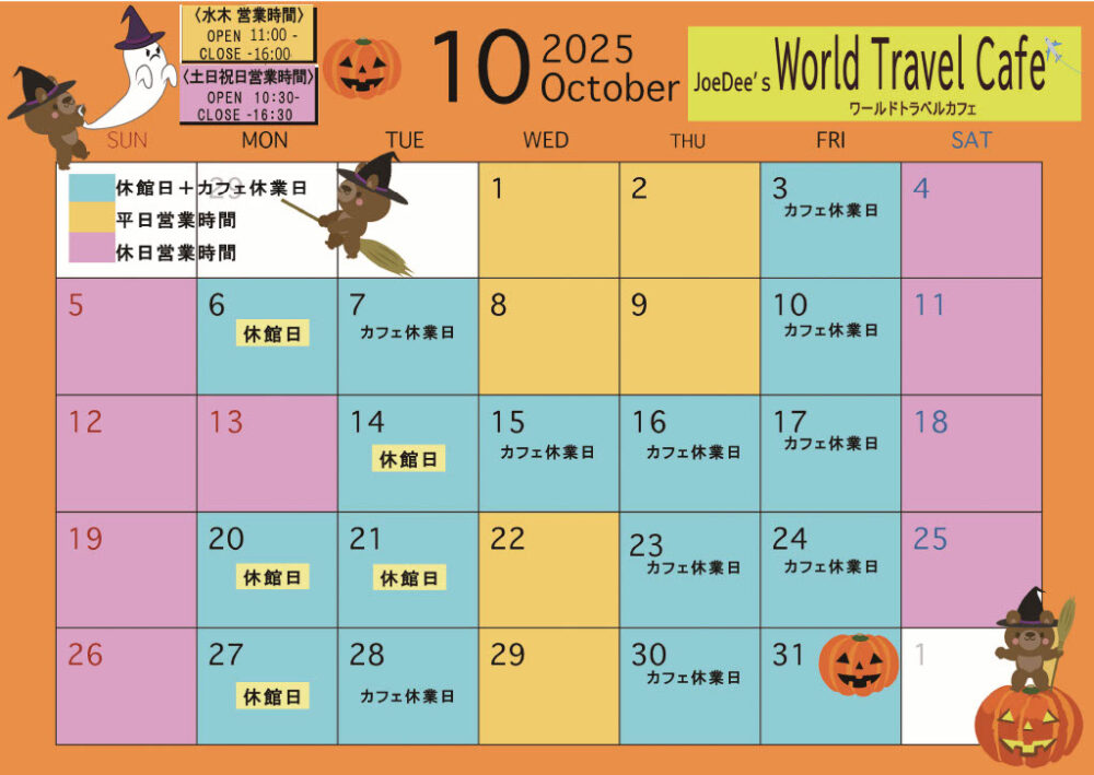 館内ワールドトラベルカフェでは、コーヒー、フルーツスムージー、フレッシュジュース、季節やイベントに応じたデザート&フードを取り揃えております!出店日はカレンダーの通りです。