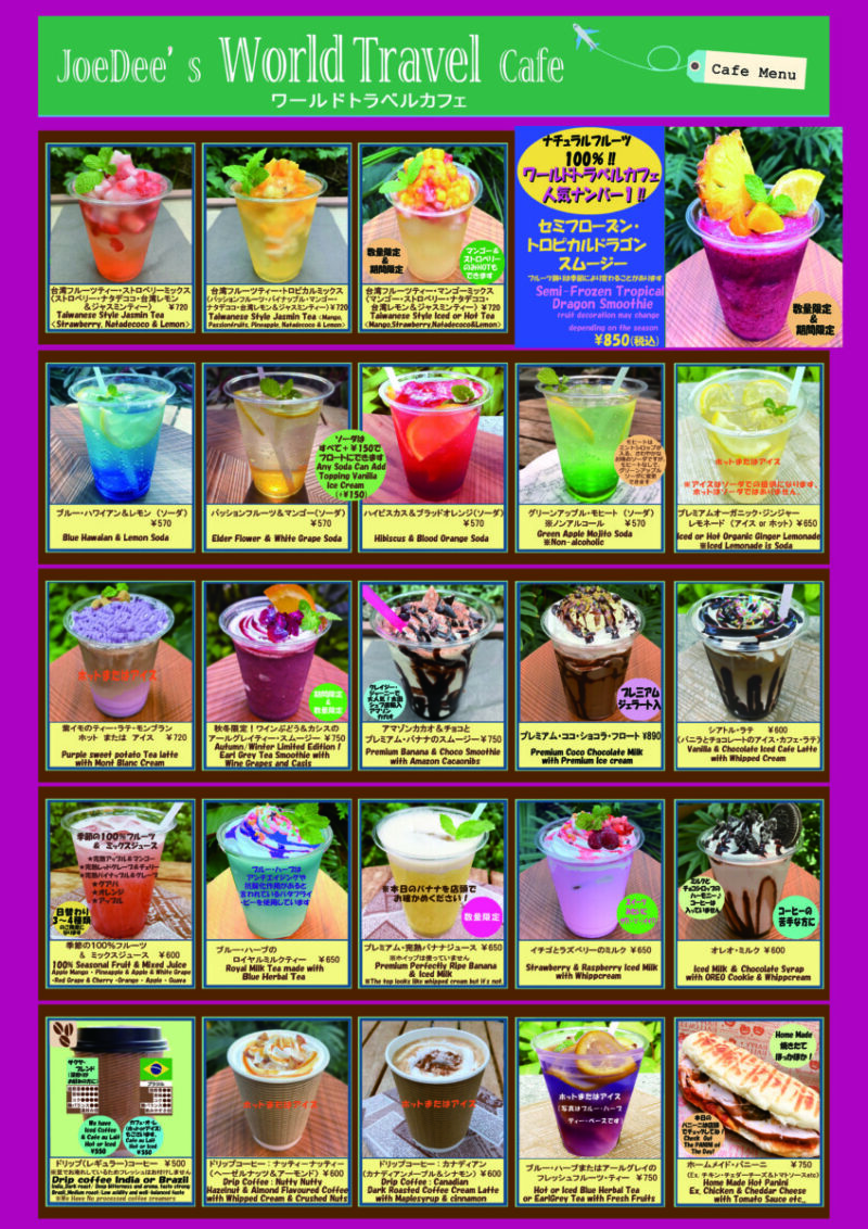 館内ワールドトラベルカフェでは、コーヒー・フルーツスムージー・フレッシュジュースをはじめ、季節やイベントに合わせたデザート&フードを取り揃えております!