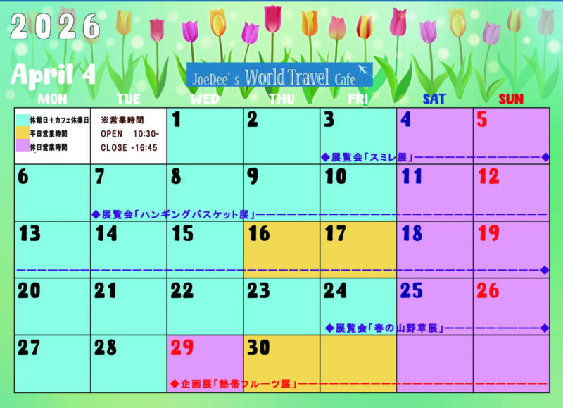 お知らせ2026.03.26 館内ワールドトラベルカフェでは、コーヒー・フルーツスムージー・フレッシュジュースをはじめ、季節やイベントに合わせたデザート&フードを取り揃えております! 出店日はカレンダーの通りです。 ※4/30は臨時休業いたします。 みなさまのお越しをお待ちしております🍀 感染予防対策を徹底し、安心してご利用いただける環境づくりに努めております。 皆さまのご来館を、スタッフ一同心よりお待ち申し上げております。